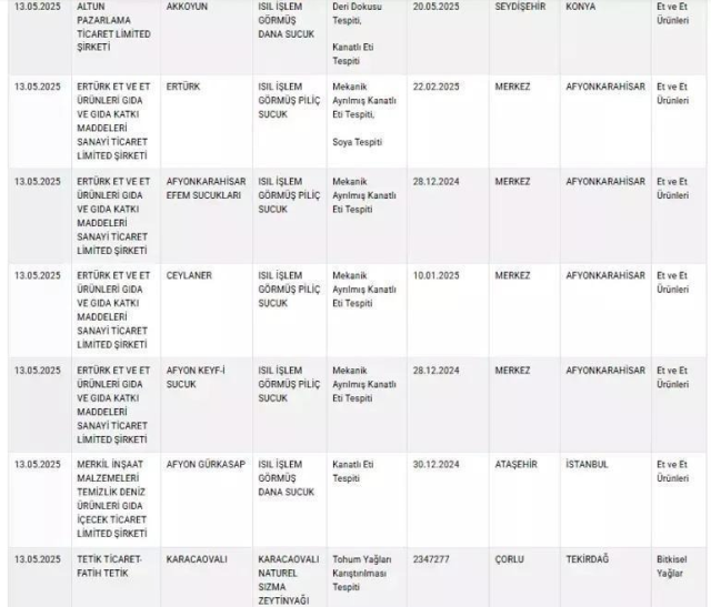 Bakanlık tarafından duyurulan listeye son olarak Sakarya, Konya, Afyonkarahisar ve İstanbul merkezli üretim gerçekleştiren firmalar dahil edilirken, hileli üretim yaptığı duyurulan firmalar ortasında marketlerde satışa sunulan ünlü sucuk markası da yer aldı.