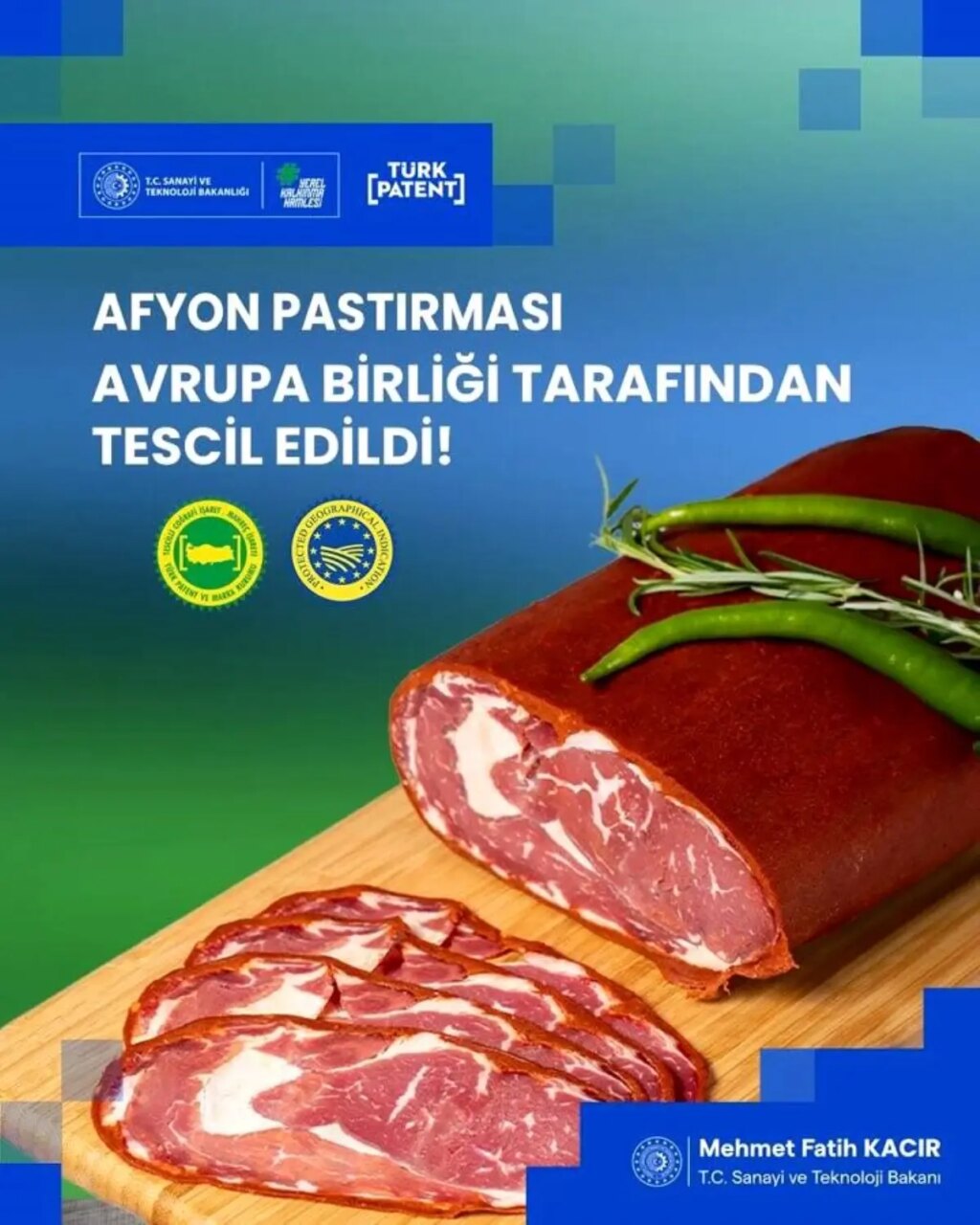 Sanayi ve Teknoloji Bakanı Mehmet Fatih Kacır, “Uluslararası coğrafik işaret tescillerimize bir yenisini ekledik. Afyon Pastırması, Avrupa Birliği’nde tescillenen 34’üncü coğrafik işaretli eserimiz oldu” dedi.