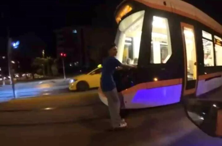 Eskişehir'de bir erkek şahıs, seyir halindeki tramvaya tutunarak paten kaydı. Motosiklet şoförünün 'Dikkat et'...