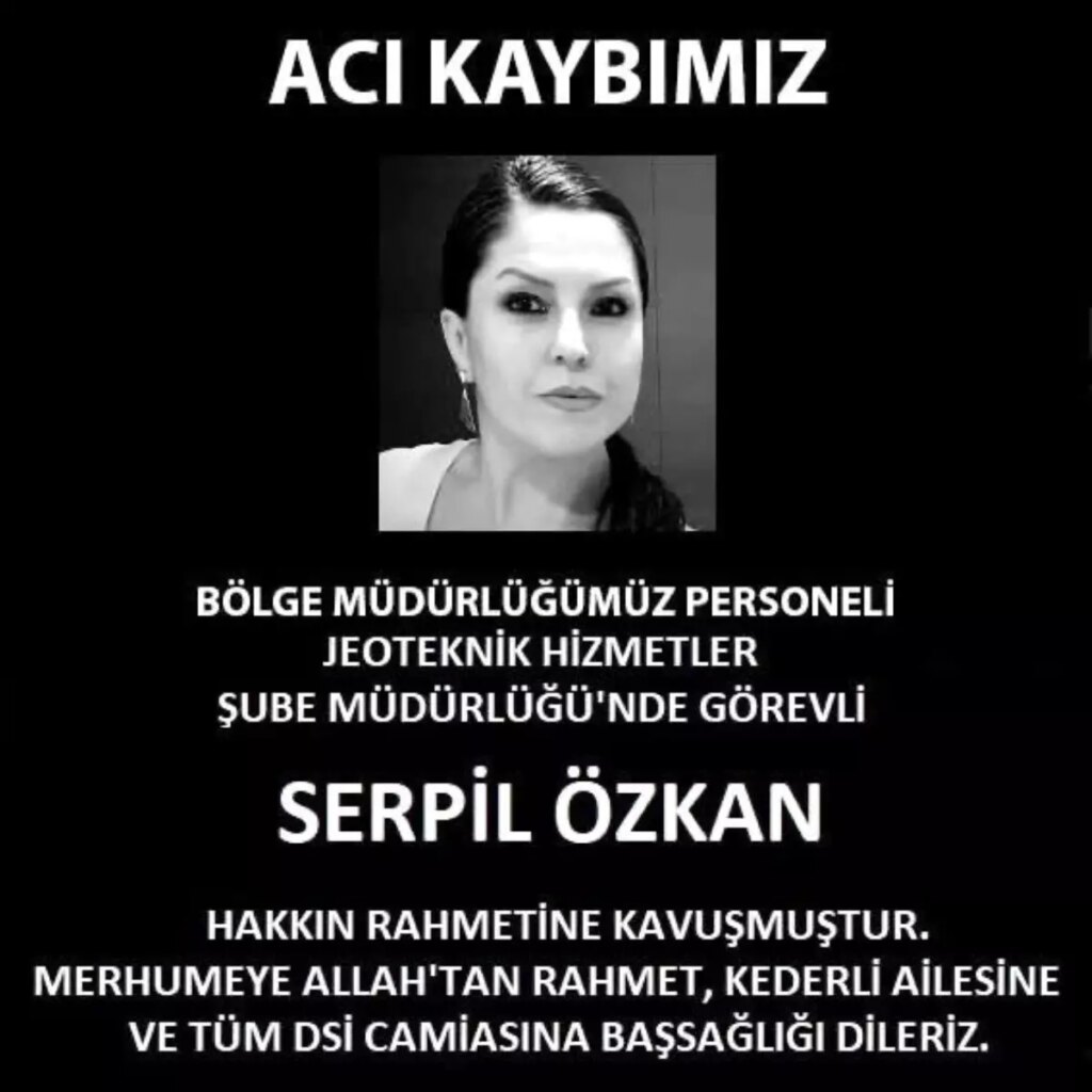 Kurumun sosyal medya hesabından yapılan paylaşımda, “Acı kaybımız. Bölge müdürlüğümüz işçisi Jeoteknik Hizmetler Şube Müdürlüğü’nde vazifeli Serpil Özkan hakkın rahmetine kavuşmuştur. Merhumeye Allah’tan rahmet, kederli ailesine ve tüm DSİ topluluğuna başsağlığı dileriz” tabirlerine yer verildi. – ESKİŞEHİR