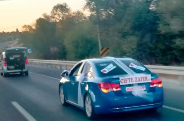 30 Ağustos Zafer Bayramı'nda evlenen bir çift, gelin arabasının gerisinde 'Çifte Zafer' yazarak özel...